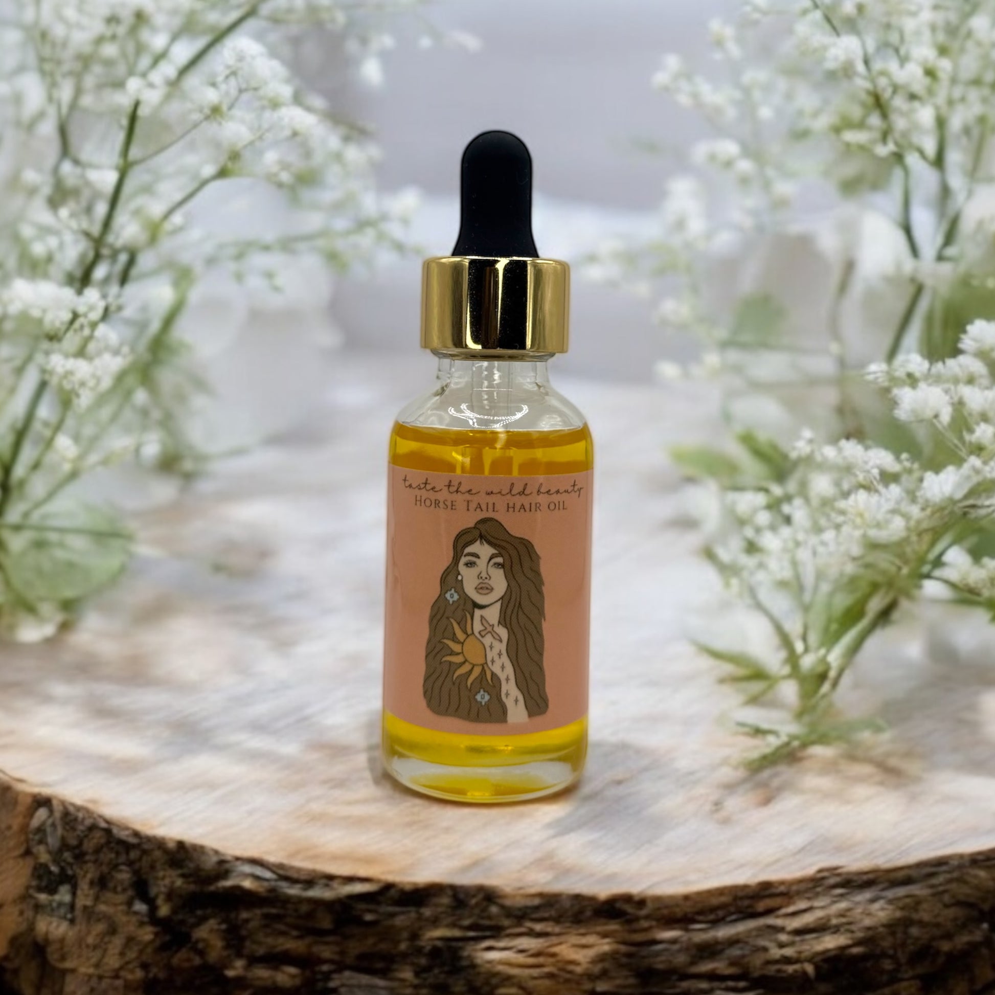 Maximize hair growth and activate thickening for longer and more luscious hair using our Horse Tail Hair Oil! For best results, use before each wash. Sold in a 1 oz. glass dropper bottle.